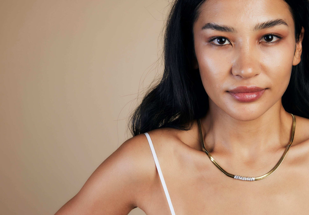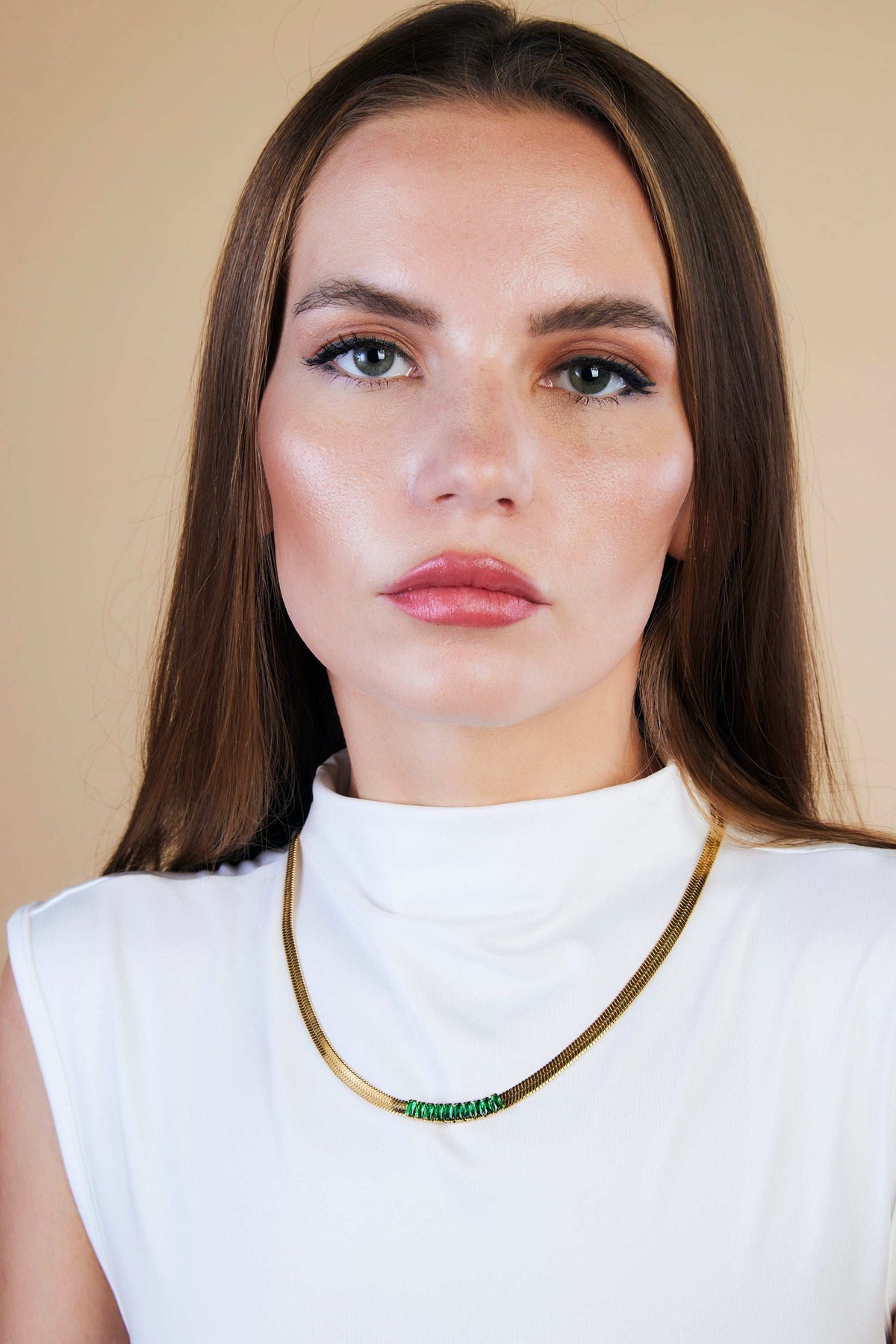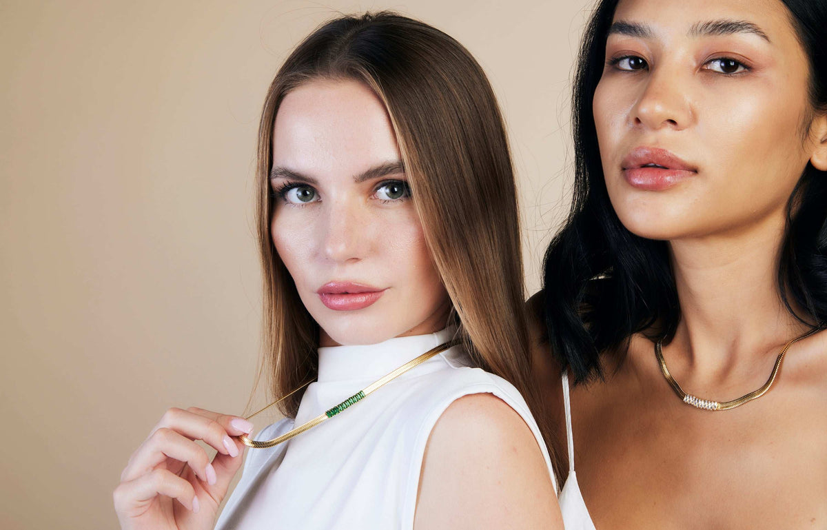 Herringbone Flat Snake Necklace with White or Green Zircon