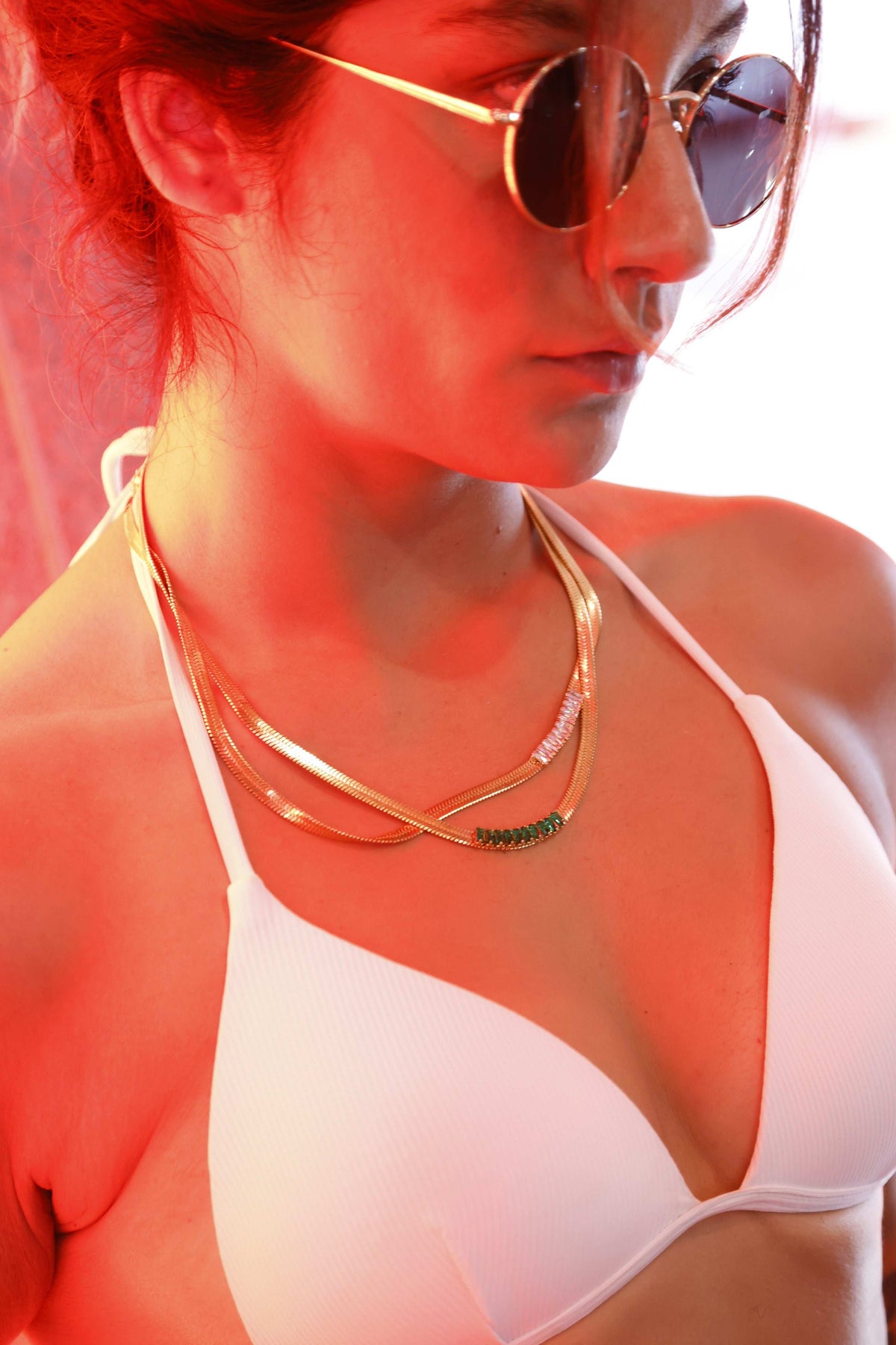 Herringbone Flat Snake Necklace with White or Green Zircon - white