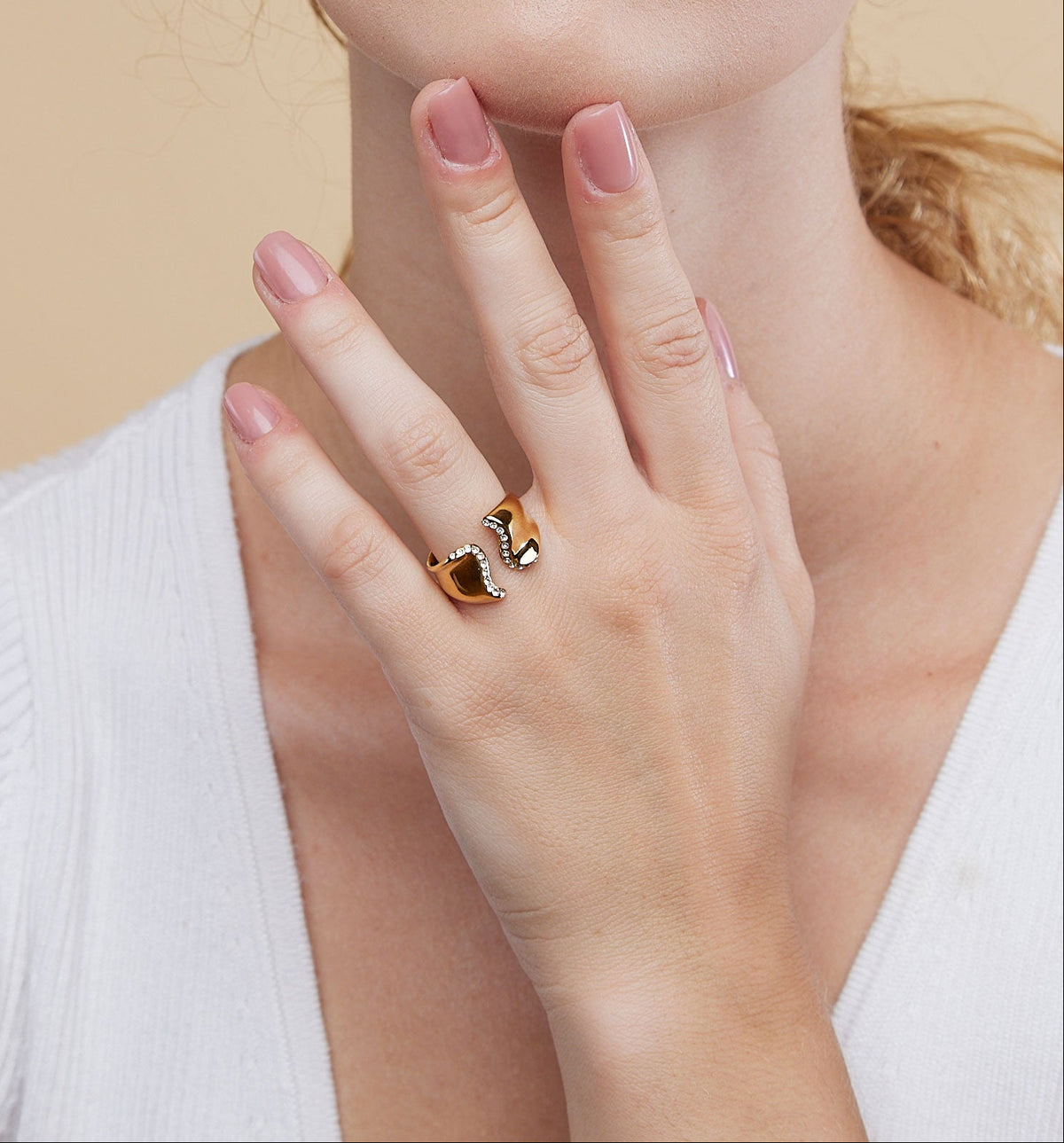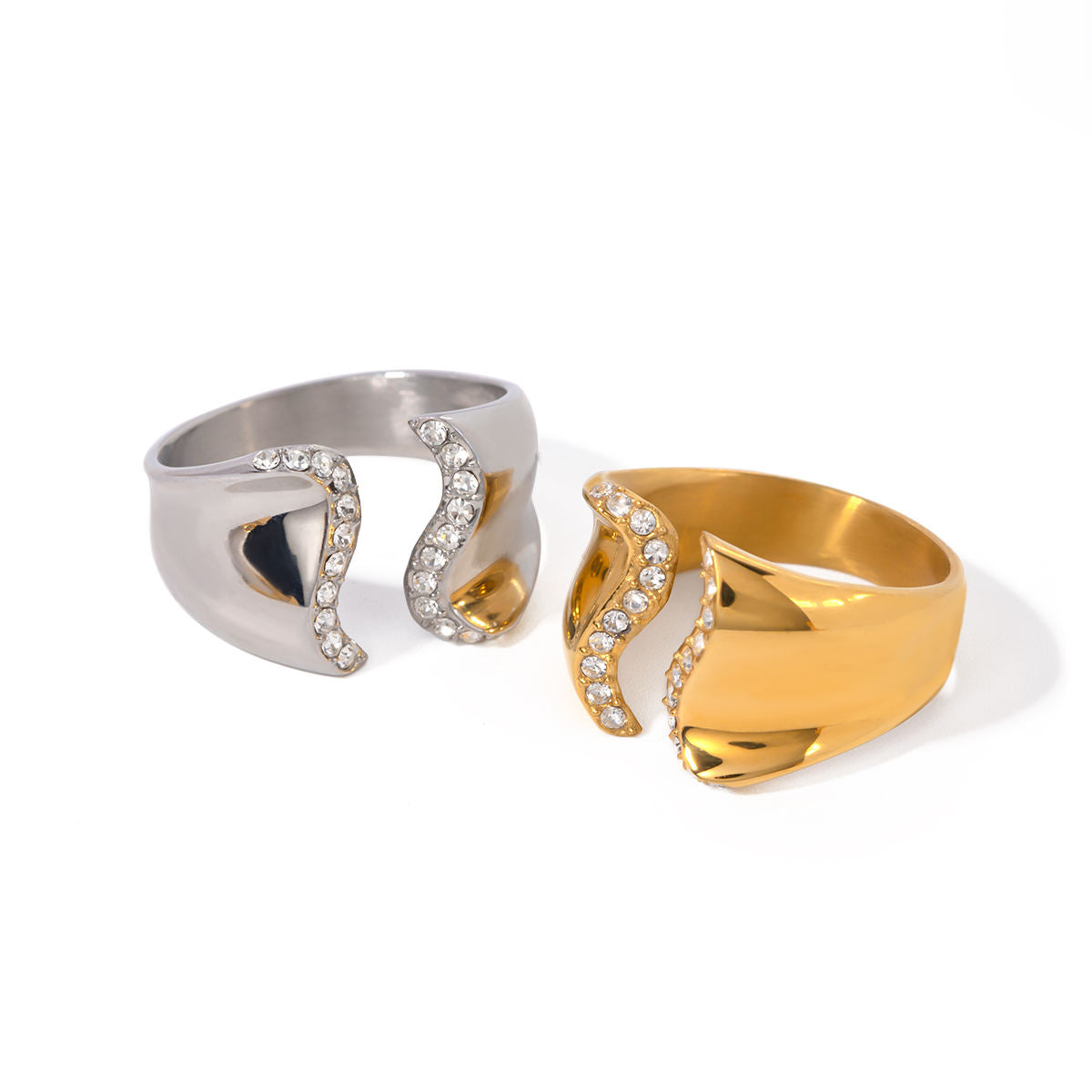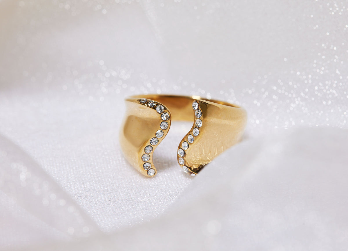 A bold, sculpted wave silhouette meets a line of sparkling cubic zirconia in this statement-making ring. Crafted from 18K gold-plated stainless steel, it’s fully waterproof, hypoallergenic, and designed to keep its shine without tarnishing. The smooth, chunky band curves organically around the finger, creating a modern look with effortless elegance.